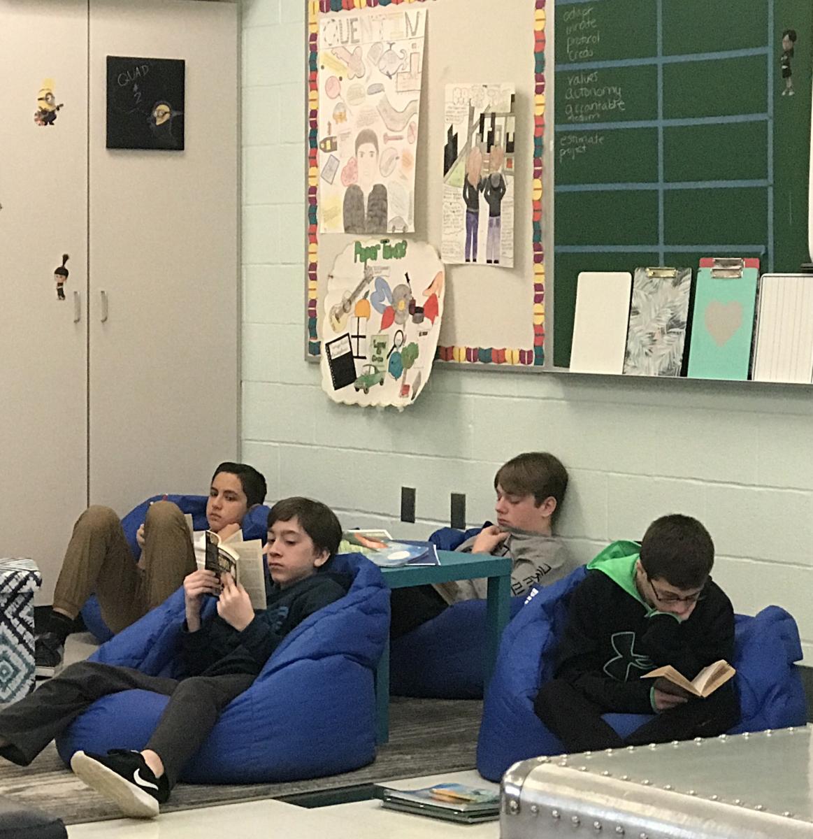 The primary way I help these kids is to make things simple. I post the reading schedule all along the main hallway my team uses. I make sure the reading schedule is sent home to parents in an email blast, and I post it to our website, flexibleclass.com. I also have a Google calendar that updates on the bottom of the page. I do give reading days, and I give students a class participation grade of 5 points—2 points for showing up with their book, and another 3 for silently reading and taking notes. Basically, I make the space for these students who might not do it for themselves. The goal, of course, is for them to fall in love with reading, become more fluent, and be able to enter the world of the book in a way that they’ll want to return again without my blocking out the time.