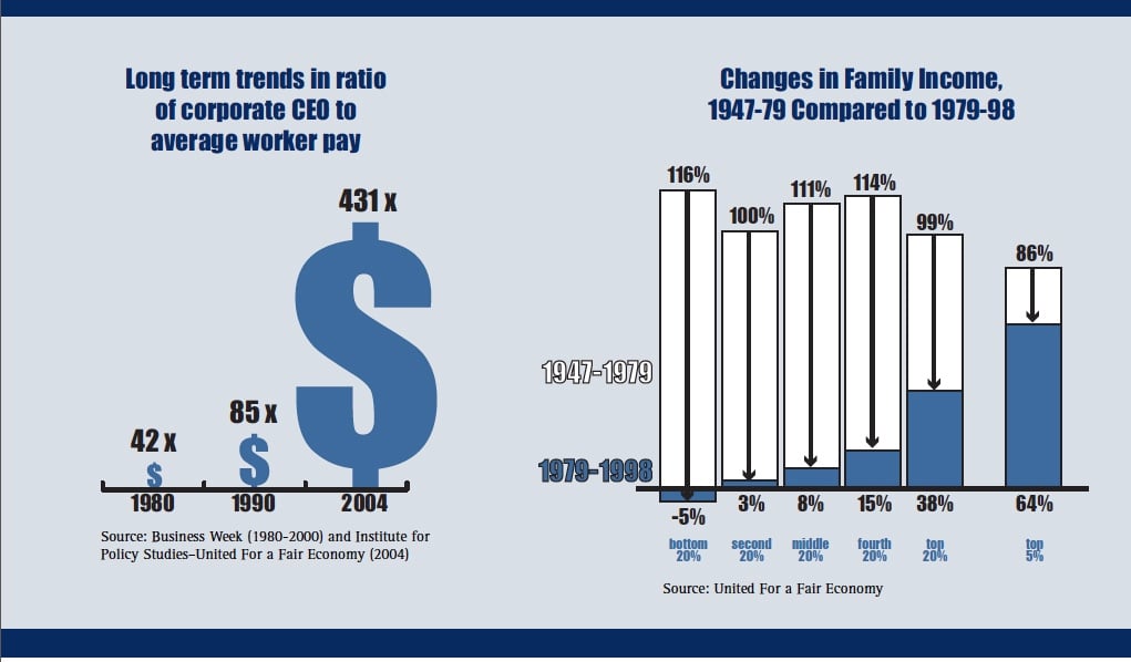 The chart on the left shows the ballooning difference in pay between the average worker and a corporate CEO. Holy heck.