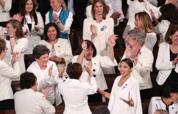 Democratic female members of Congress, including Rep. Alexandria Ocasio-Cortez (D-NY) (lower, R), cheer after U.S. President Donald Trump said there are more women in Congress than ever before during his second State of the Union address to a joint session of the U.S. Congress in the House Chamber of the U.S. Capitol on Capitol Hill in Washington, Feb. 5, 2019. REUTERS/Jonathan Ernst