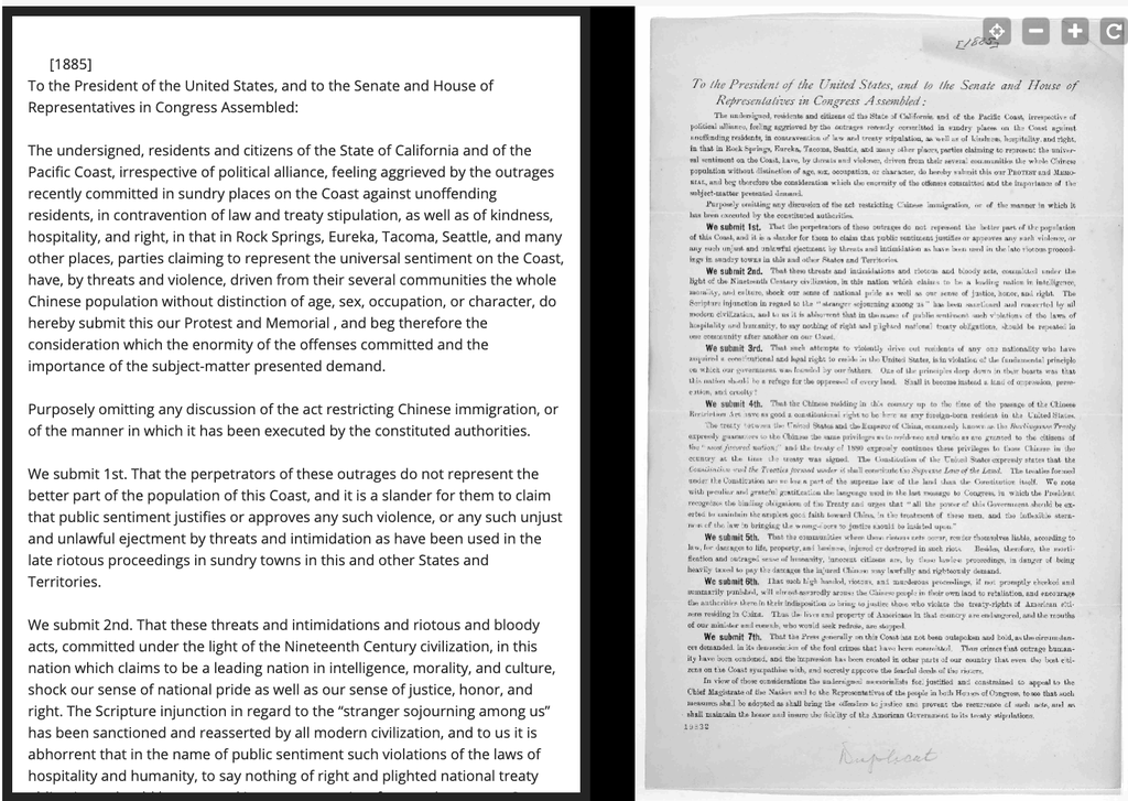 In this broadside or leaflet distributed to the public in 1885, titled "To the president of the United States, and to the Senate and House of Representatives in Congress assembled [Protest against ill-treatment of the Chinese. s. l., 1885]," protesters in 1885 urged the U.S. government to stop violence against Chinese people.
