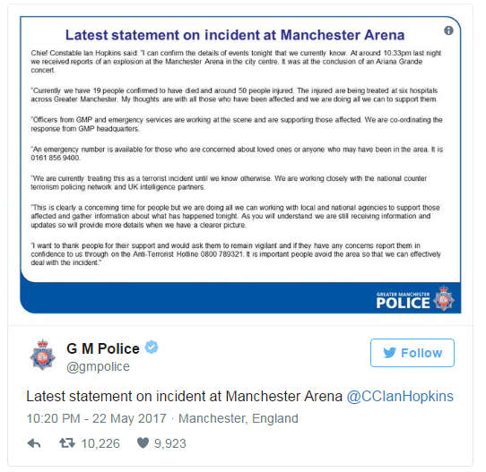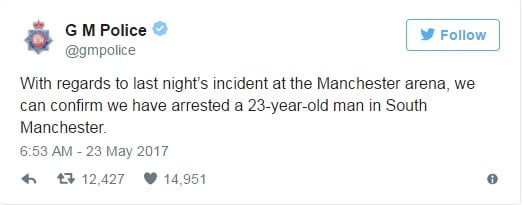 The explosion, which occurred around 10:33 p.m. local time, led to mass panic among concertgoers and is being treated as a terrorist attack “until police know otherwise,” the Manchester Police reported on Twitter. Police say they have arrested a 23-year-old man in South Manchester in connection to the attacks.