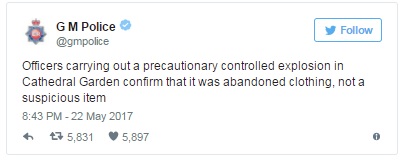 Nearby Victoria Station, which serves the arena, was evacuated and trains were halted. Around 8:30 p.m. EST, police said they set off a controlled explosion near what they believed to be a suspicious item in Cathedral Gardens, a neighborhood near the stadium. Police determined the suspicious object was in fact abandoned clothing.