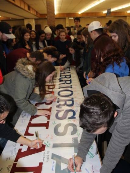 Students in upstate New York signing a banner during the March 14th walkout to send to Parkland, Florida. Photo credit: 13WHAM.com |